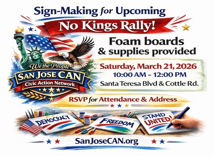 San Jose CAN is a newly formed, grassroots, volunteer-led civic action network in San Jose, California, and a local chapter of the nationwide Indivisible movement. San Jose CAN advances social justice, equal rights, and humanitarian causes through civic education, advocacy, and peaceful public action, while promoting voter rights, election integrity, and accountable government at the local, state, and federal levels.