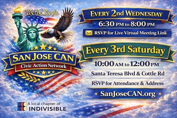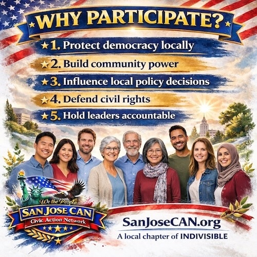 San Jose CAN is a newly formed, grassroots, volunteer-led civic action network in San Jose, California, and a local chapter of the nationwide Indivisible movement. San Jose CAN advances social justice, equal rights, and humanitarian causes through civic education, advocacy, and peaceful public action, while promoting voter rights, election integrity, and accountable government at the local, state, and federal levels.